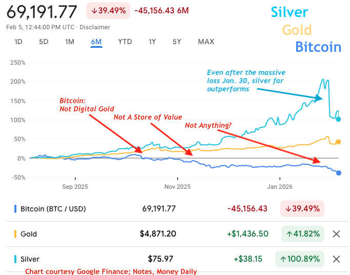 The last trading day of the month, Friday, January 30, was a bummer for just about everybody, except those invested in oil or natural gas. Everything got sent lower, but especially gold, silver, and bitcoin, the alternatives to fiat currencies that are supposed to save the backsides of all of humankind in the event of a black swan event, systemic collapse of the global economy, or the outbreak of a military conflict between the great powers.